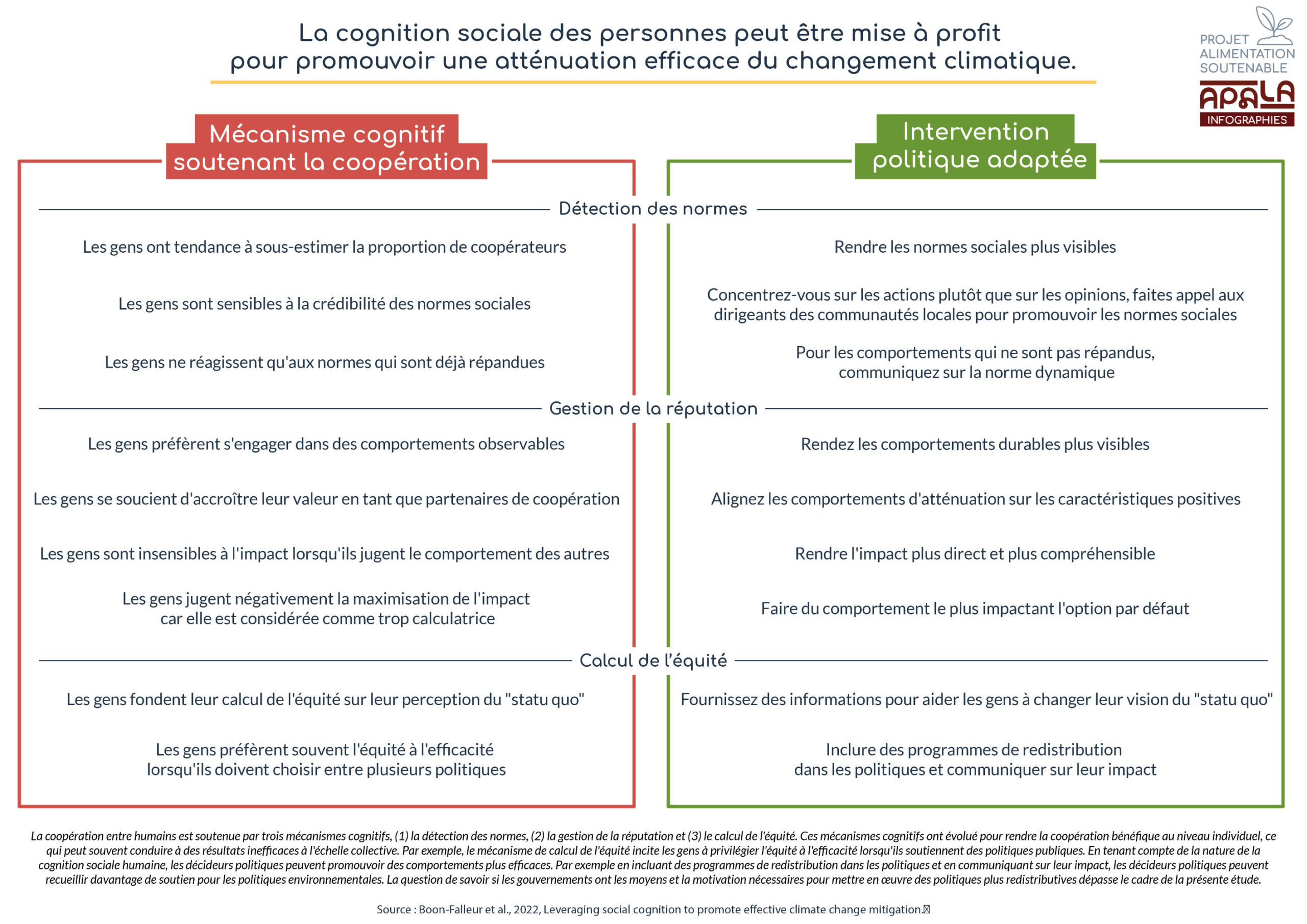 De manière plus large, la chercheuse Mélusine Boon-Falleur et ses collègues ont publié une étude en 2022[11] qui propose de s’aider de la cognition sociale pour promouvoir une atténuation efficace du changement climatique. L’exemple de l’alimentation y est repris.