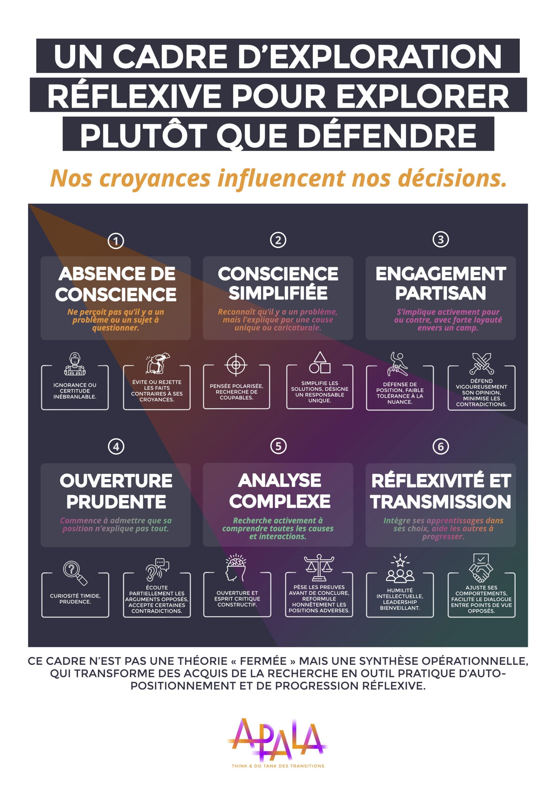 Le cadre d’exploration réflexive propose un chemin pour situer et enrichir sa manière de penser, de l’intuition spontanée à la lucidité critique.