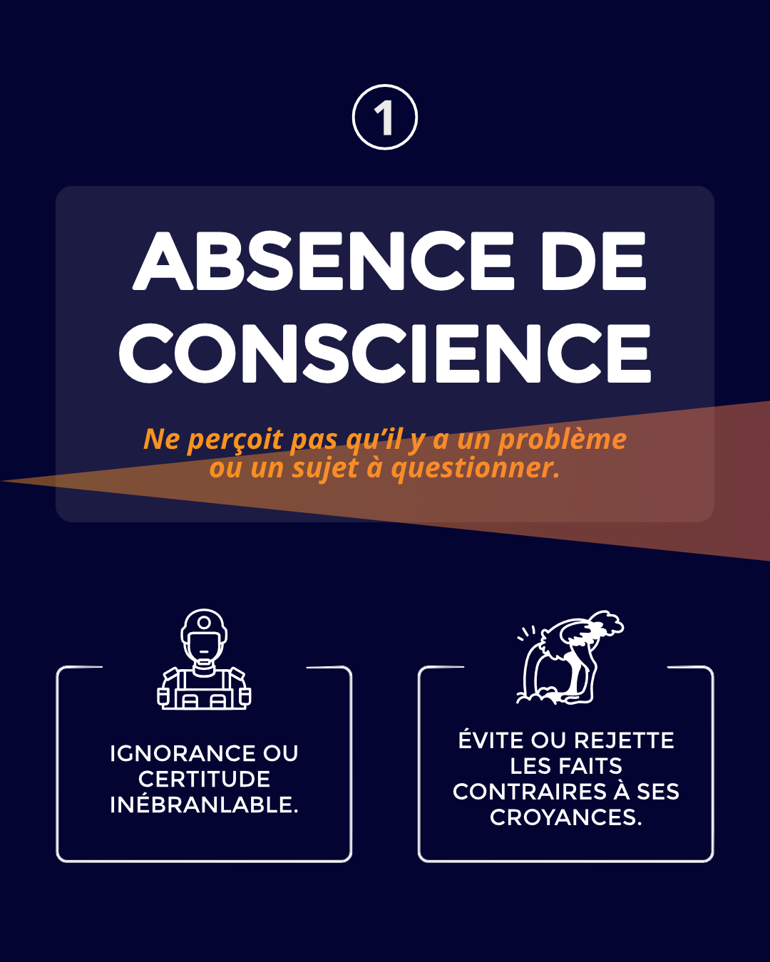 Au point de départ, chacun de nous a tendance à défendre ses croyances et ses idées. Nos intuitions premières servent de boussole, mais elles s’accompagnent aussi de biais : nous cherchons des arguments qui confirment ce que nous pensons déjà, nous rejetons instinctivement ce qui nous contredit, nous confondons la loyauté à un groupe avec la vérité d’une idée. Ces mécanismes ne sont pas des fautes, ils sont humains : ils correspondent aux premiers niveaux de la maturité réflexive.