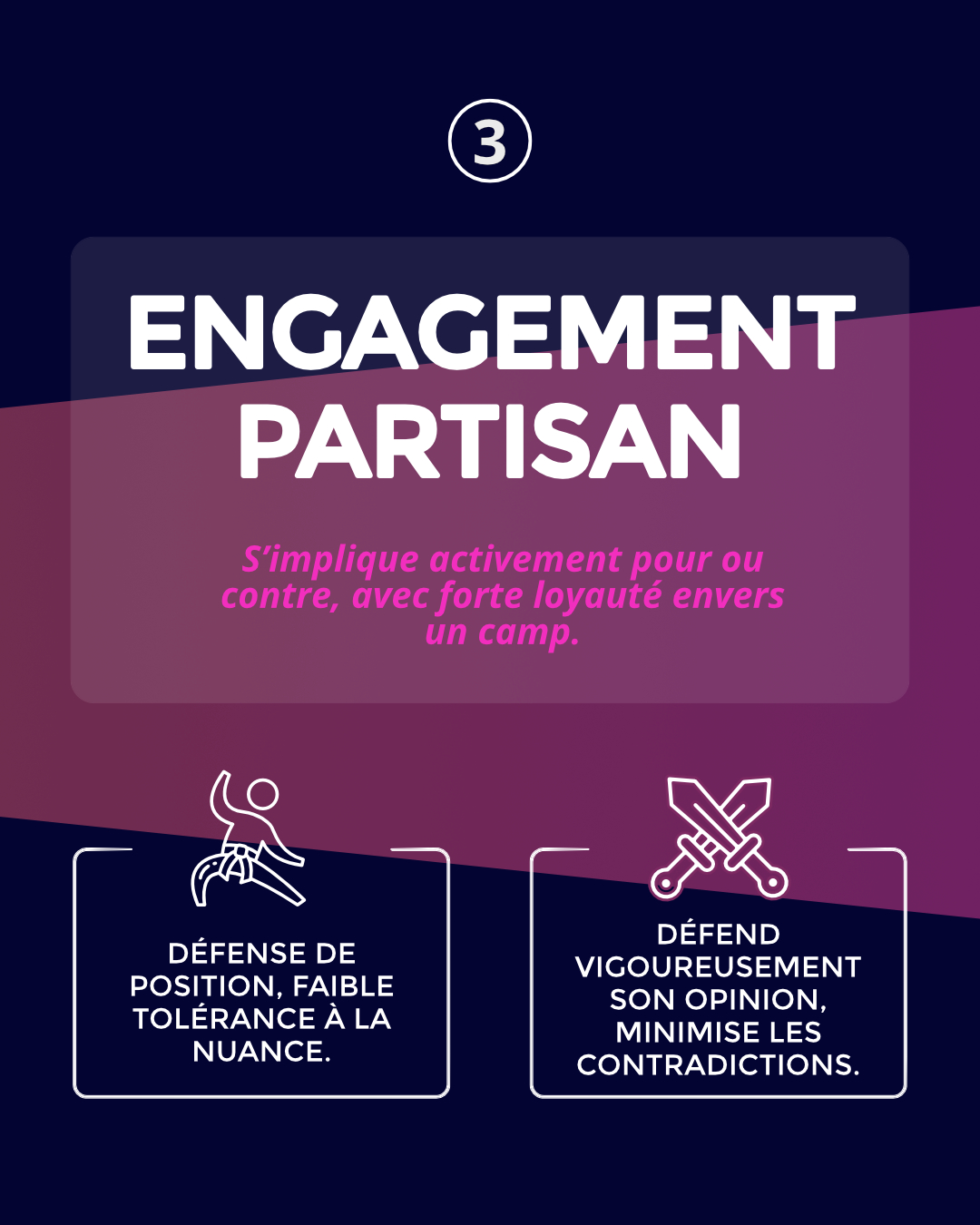 À un stade plus partisan, l’engagement s’affirme : on milite pour des causes progressistes en bloc, souvent en valorisant la posture morale de son camp. Le progressisme devient une identité, et toute remise en question interne — par exemple sur ses excès ou contradictions — est vécue comme une trahison.