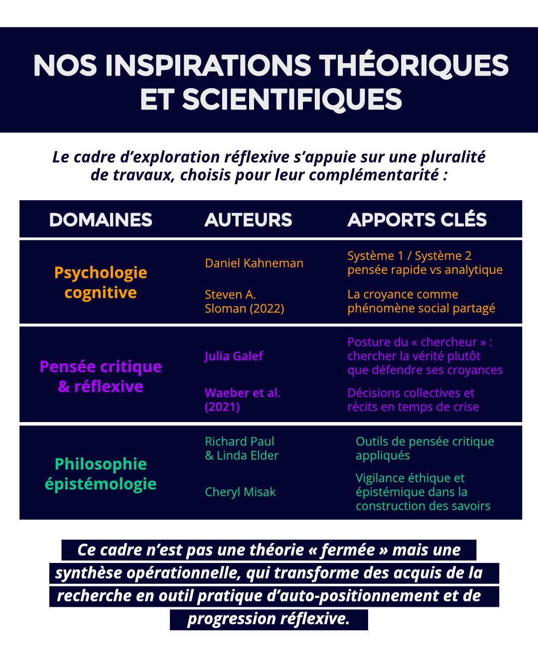 Ce cadre s’appuie sur des travaux variés en sciences cognitives, en psychologie et en philosophie, qui convergent vers une même idée : la maturité réflexive n’est pas un état, mais un cheminement. C’est la capacité de passer du réflexe de défense à l’habitude d’exploration, de la fermeture à l’ouverture, de la certitude fragile à la lucidité critique.